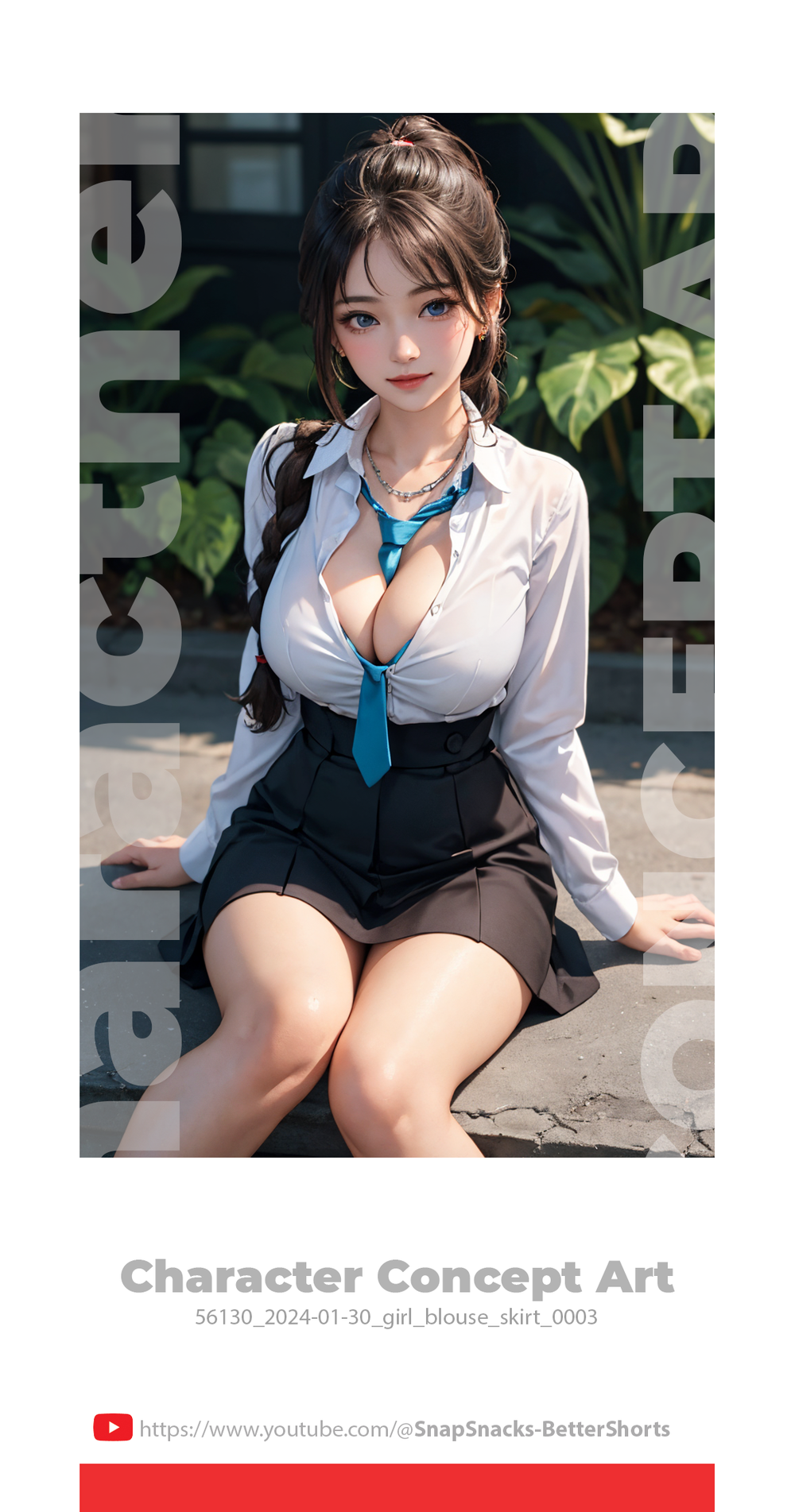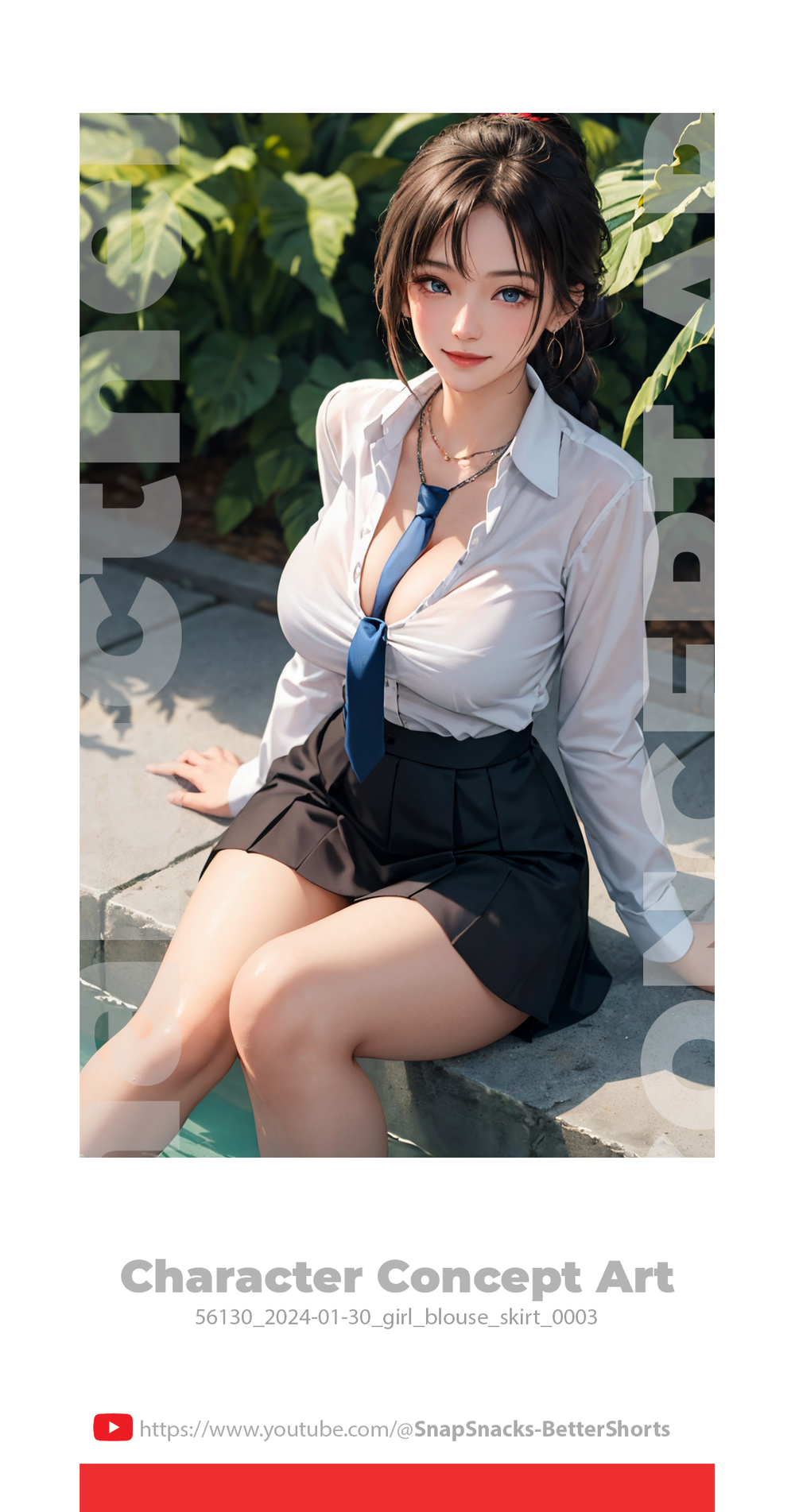 The straightforward design of the white blouse and blue tie against the background of a clear sky emphasizes the elegance of simplicity, drawing attention to the character without unnecessary distractions.